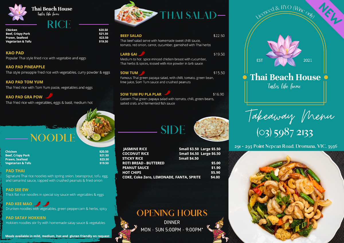 Welcome to Thai Beach House, a hidden gem located at 291-293 Point Nepean Rd in Dromana, VIC. This Thai restaurant captures the essence of authentic Thai cuisine with a menu that delights the senses.